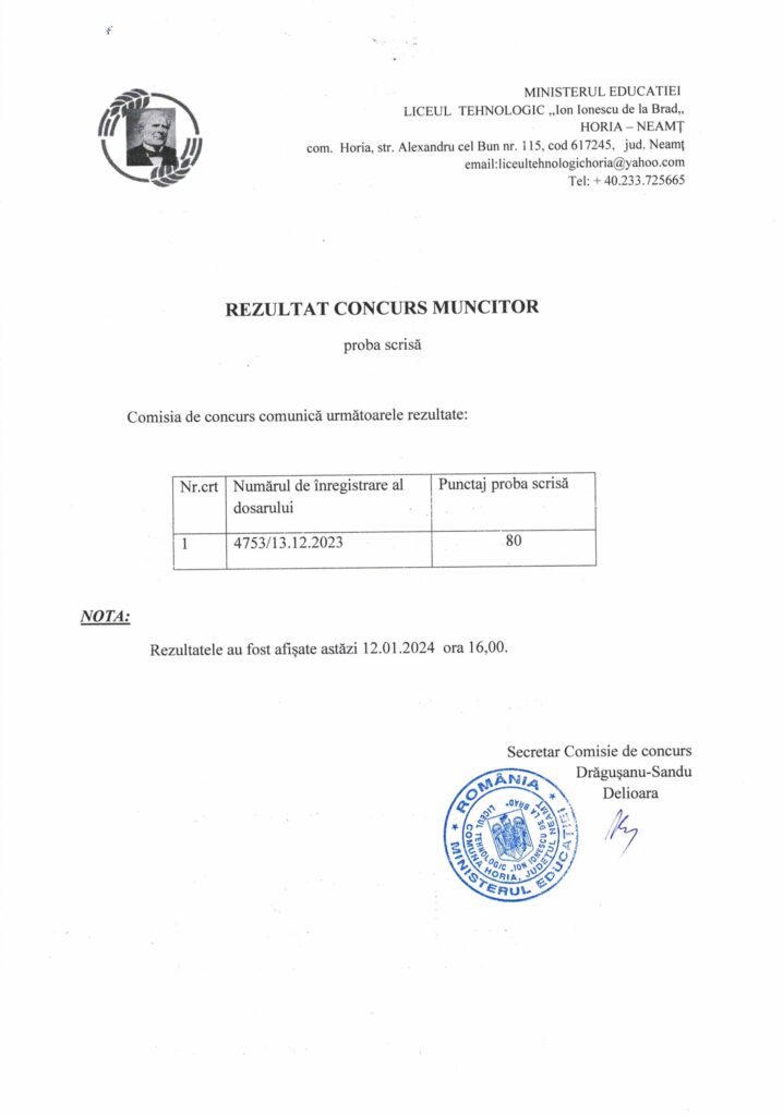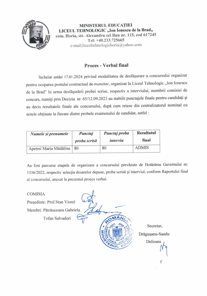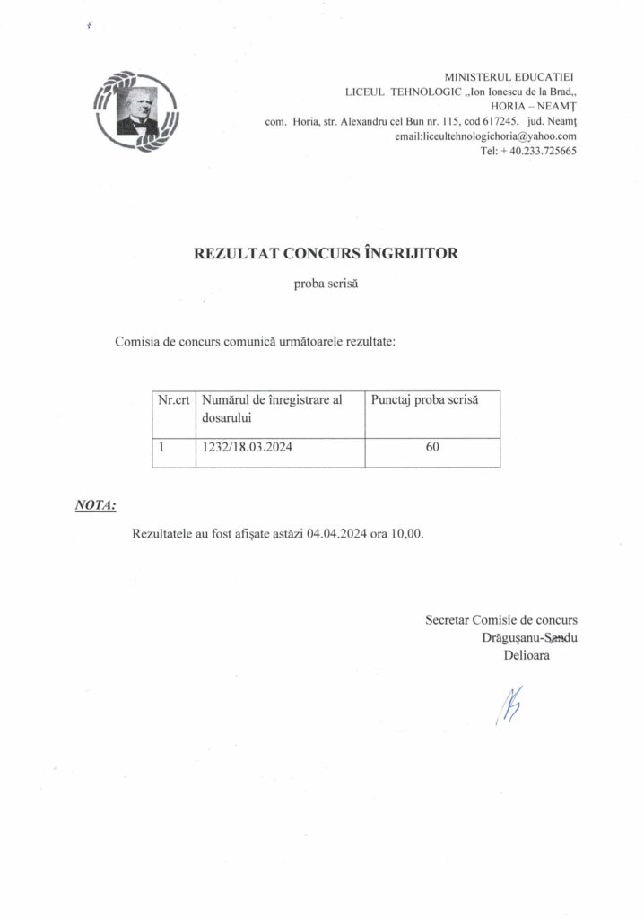 Relații suplimentare se pot obține la sediul Liceului Tehnologic ,,Ion Ionescu de la Brad”, com.Horia, jud.Neamț, str.Alexandru Cel Bun, nr.115, tel: 0233 725 665.