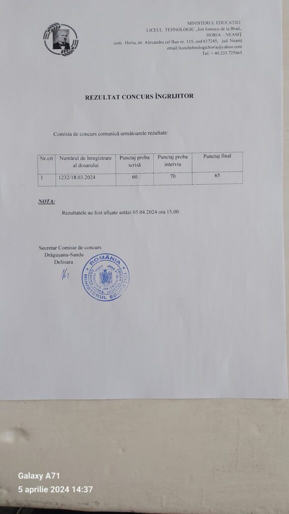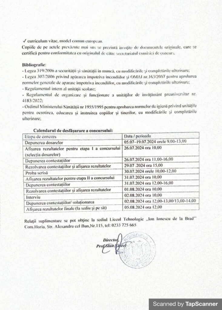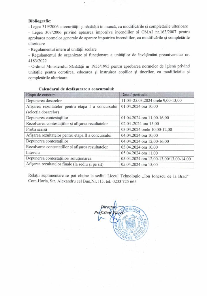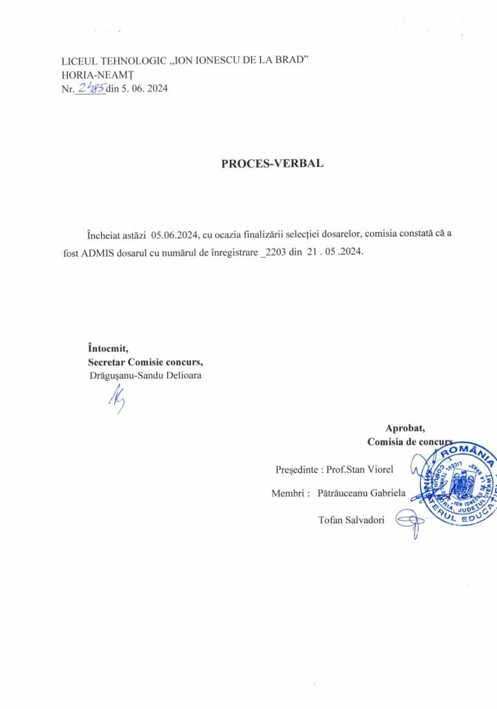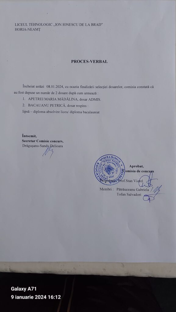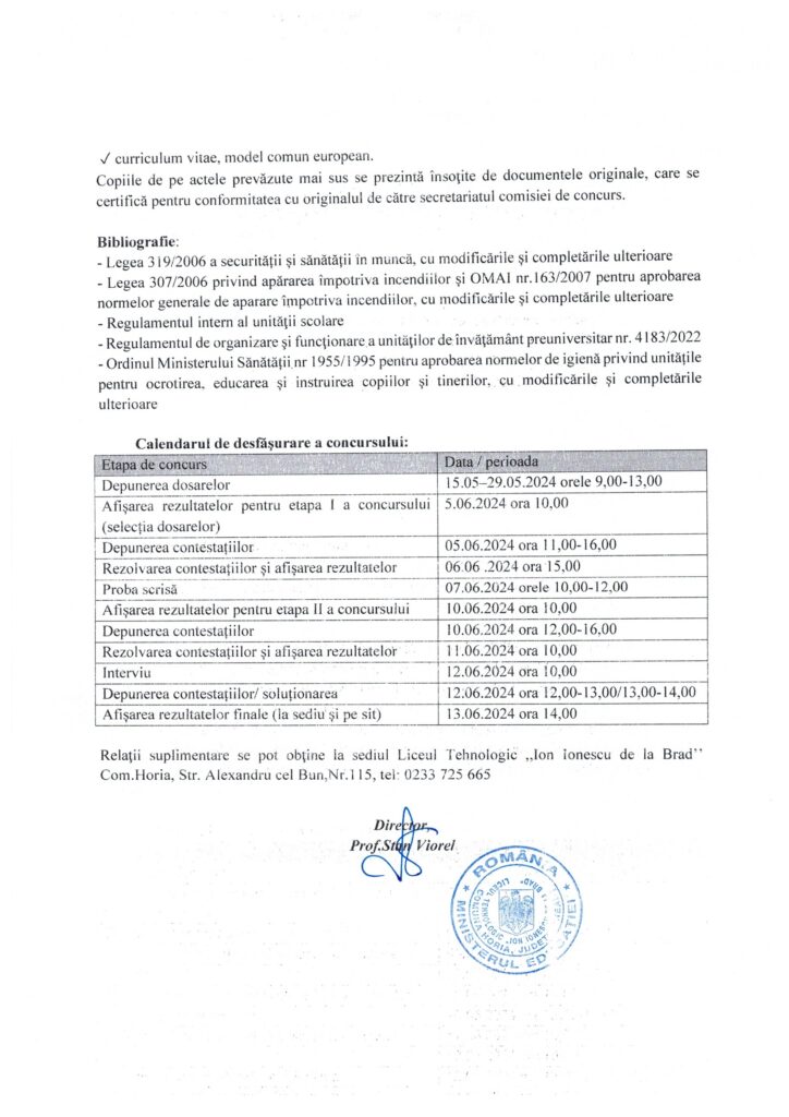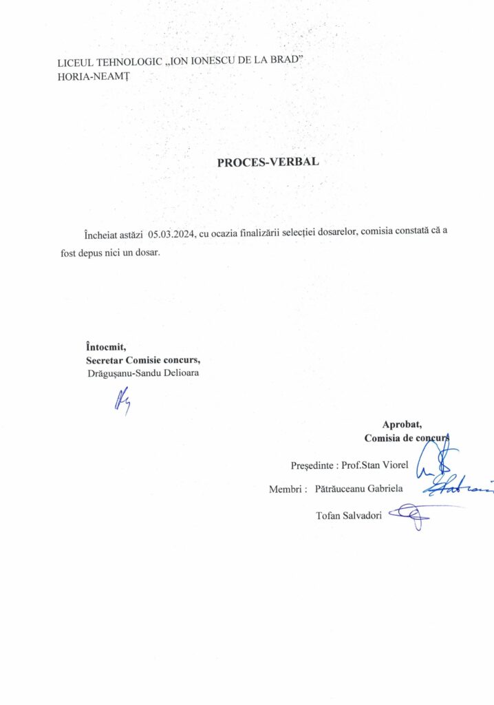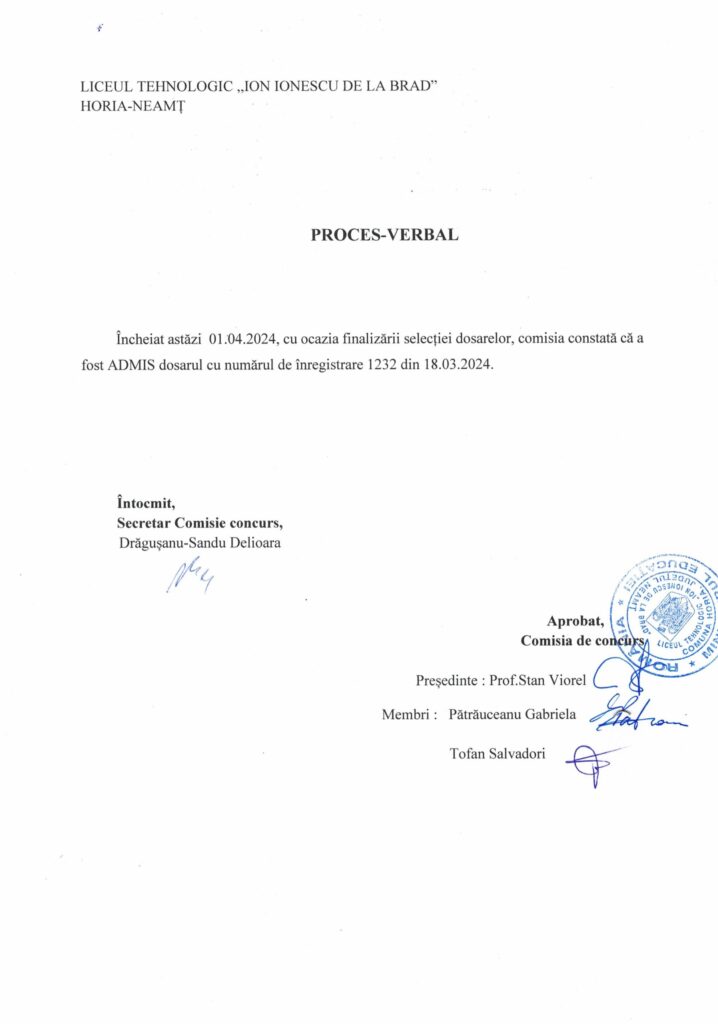 Dosarul de concurs se depune la secretariatul Liceului Tehnologic ,,Ion Ionescu de la Brad” Horia-Neamț.