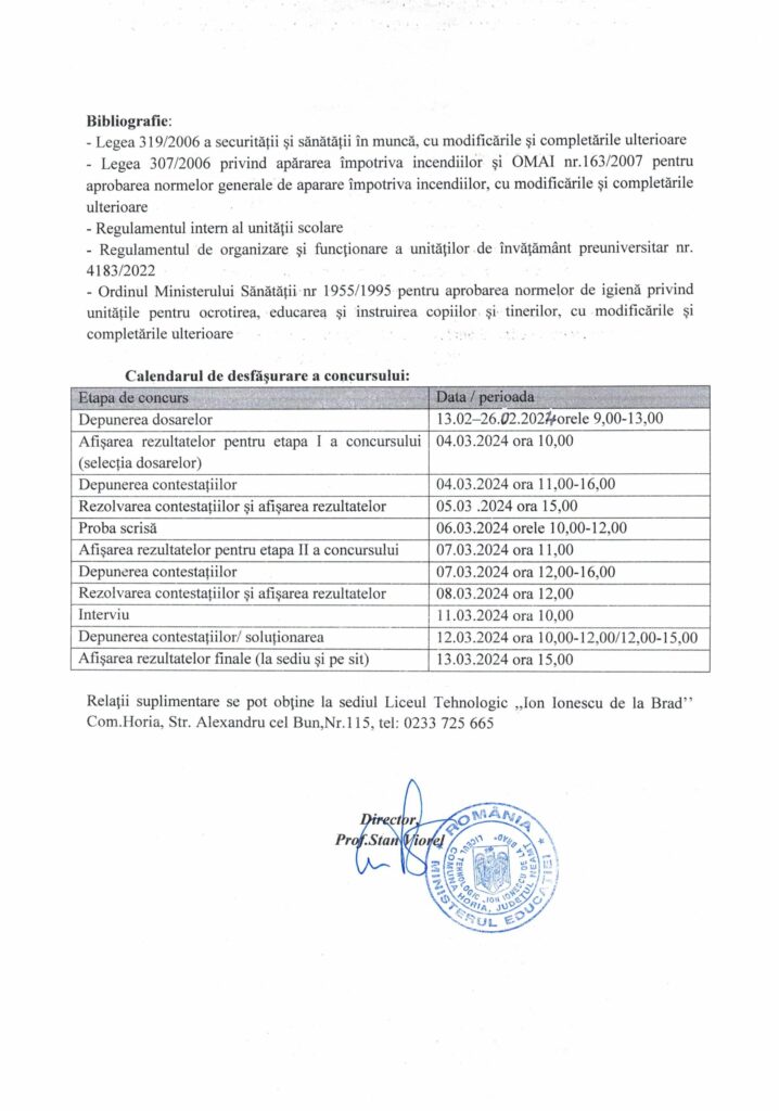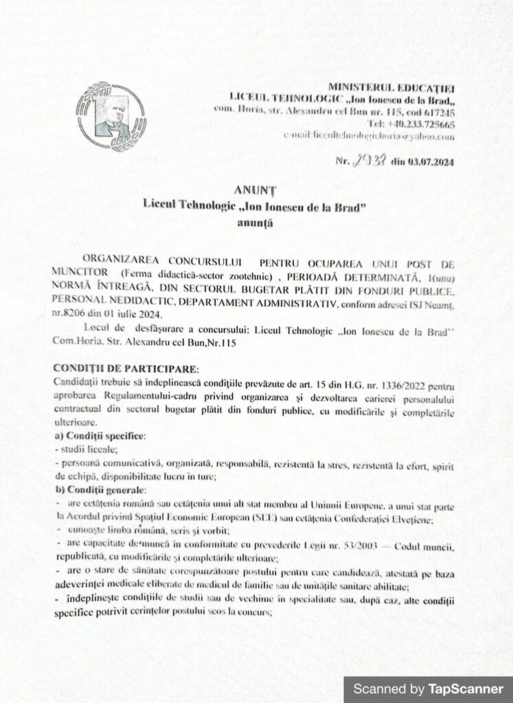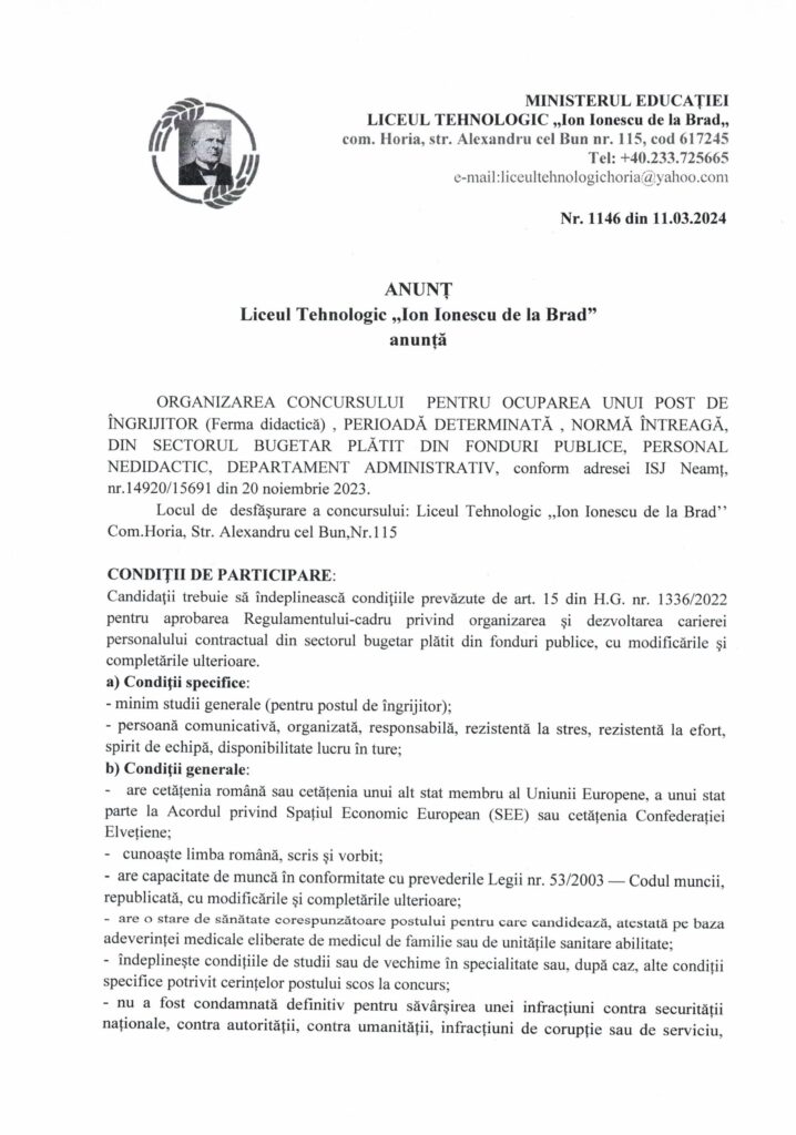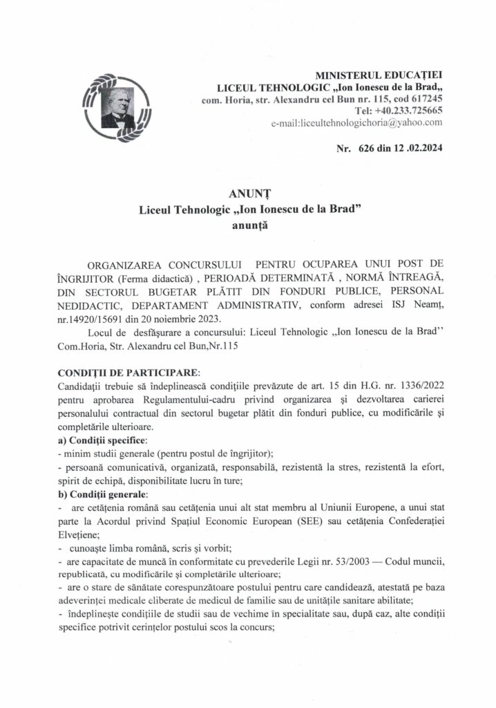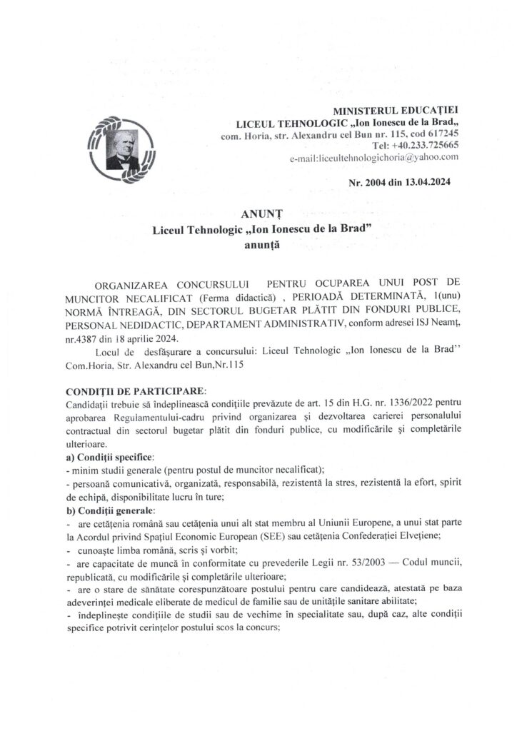 În conformitate cu prevederile Hotărârii nr. 1336 din 28 octombrie 2022 pentru aprobarea Regulamentului-cadru privind organizarea şi dezvoltarea carierei personalului contractual din sectorul bugetar plătit din fonduri publice, Liceul Tehnologic ,,Ion Ionescu de la Brad” organizează concurs pentru ocuparea următoarei funcții contractuale: