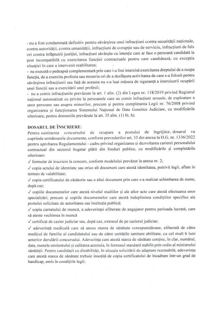 Pentru sustinerea concursului de ocupare a postului de îngrijitor,