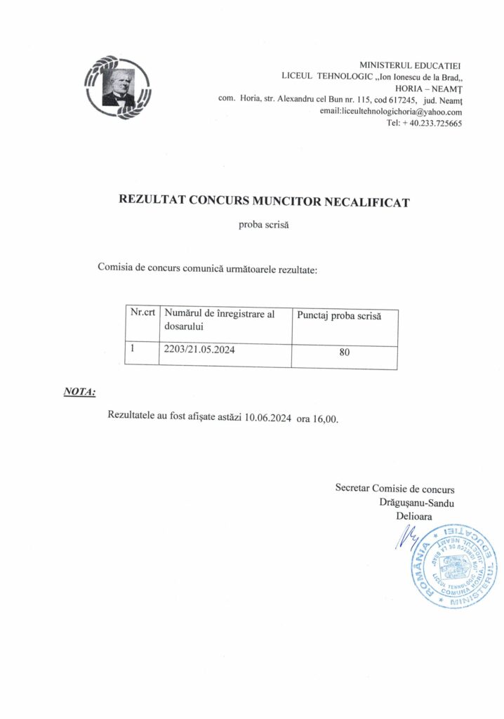 Urmare adresei Inspectoratului Școlar Județean Neamț cu nr.8206/8445 din 08 iulie 2024 se suspendă organizarea concursului pentru postul de muncitor.